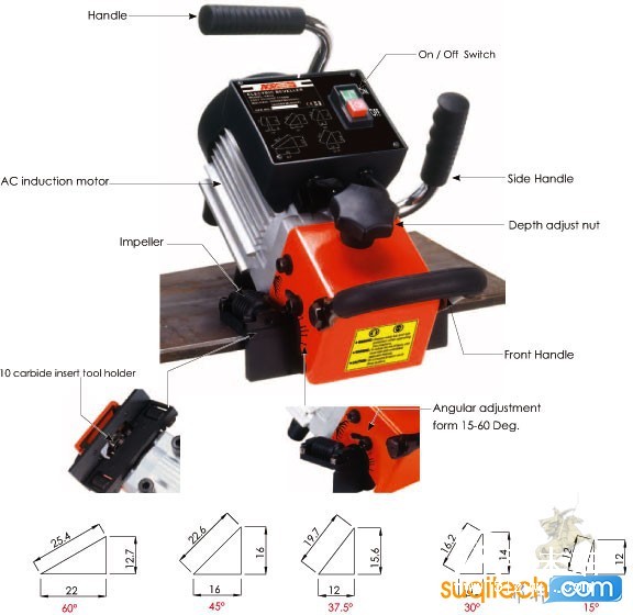 電動倒角機EB24配備的交流異步電動機提供更長的耐用性和更低的噪音,以及其高扭矩。銑削角度可調節,逐步從15 °?60 °,一個最大的坡面寬度為25.4毫米。體重只有19.3公斤,非常方便,結構緊湊,堅固耐用的設計使易于搬運和施工操作方便 |