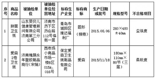 11日,記者從濟南市工商局了解到,市工商局委托國家紙張質量監督檢驗中心,對濟南市流通領域內經銷的部分衛生紙、衛生巾、紙尿褲等紙制品進行了法定抽查檢驗。標稱“圖形”的抑菌衛生紙和標稱“愛森”的愛森2卷衛生紙分別因塵埃度和柔軟度不合格。