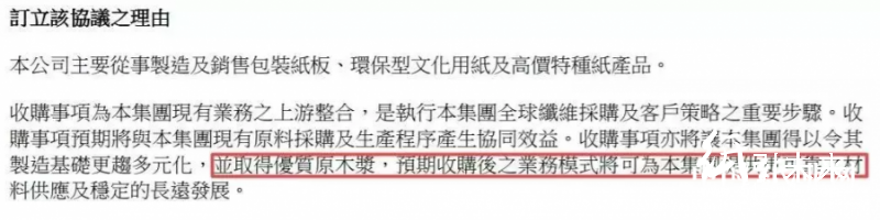 我們從玖龍紙業曾發布的公告里能發現一些蛛絲馬跡,“收購事項為本集團現有業務之上游整合,是執行本集團全球范圍采購及客戶策略的重要步驟。收購事項預期將與本集團現有原料采購及生產程序產生協同效益。同時使集團得以令其制造基礎更趨多元化,并取得優質原木漿,預期收購后的業務模式將為集團提供更可靠的材料供應及穩定的長遠發展。”