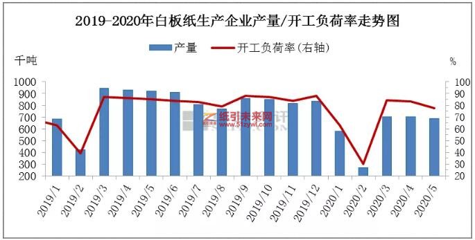 2020年1-5月份白板紙開工負荷率維持在68%左右,較去年同期下降5個百分點,且2月份因復工延后,白板紙開工負荷率僅為30%。年初富陽地區(qū)產(chǎn)能騰退150萬噸,1-5月份總產(chǎn)量較去年同期減少24.49%。紙廠庫存情況來看,截至5月底,白板紙企業(yè)庫存量較去年同期增加5.84%。白板紙產(chǎn)量大幅減少,但庫存小幅增加,需求壓力仍存。