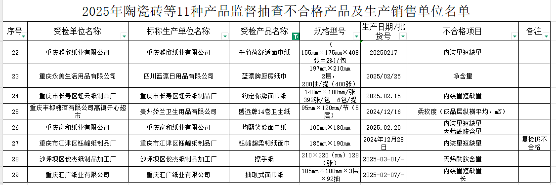 紙引未來網訊 9月19日,重慶市市場監管局網站發布2025年陶瓷磚等11種產品質量市級監督抽查情況通報。本次抽查發現8批次家用紙制品產品不合格。不合格項目涉及允許短缺量、凈含量、柔軟度、丙烯酰胺含量、尺寸偏差、內裝量短缺量。