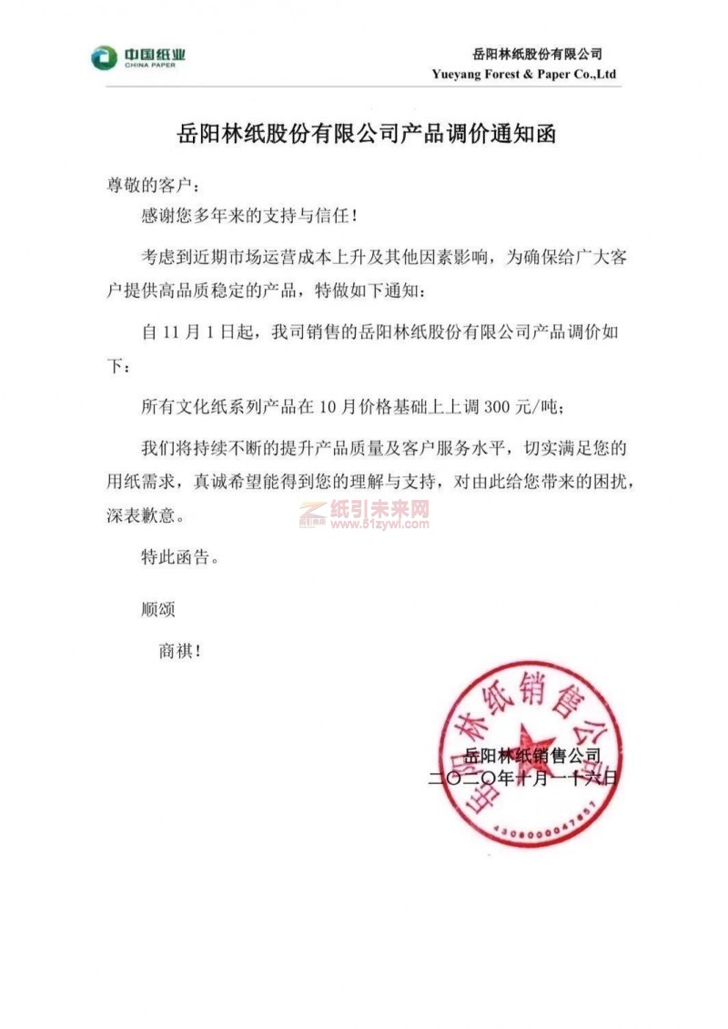 【通知】2020年11月1日岳陽林紙股份有限公司文化紙系列產品調價函