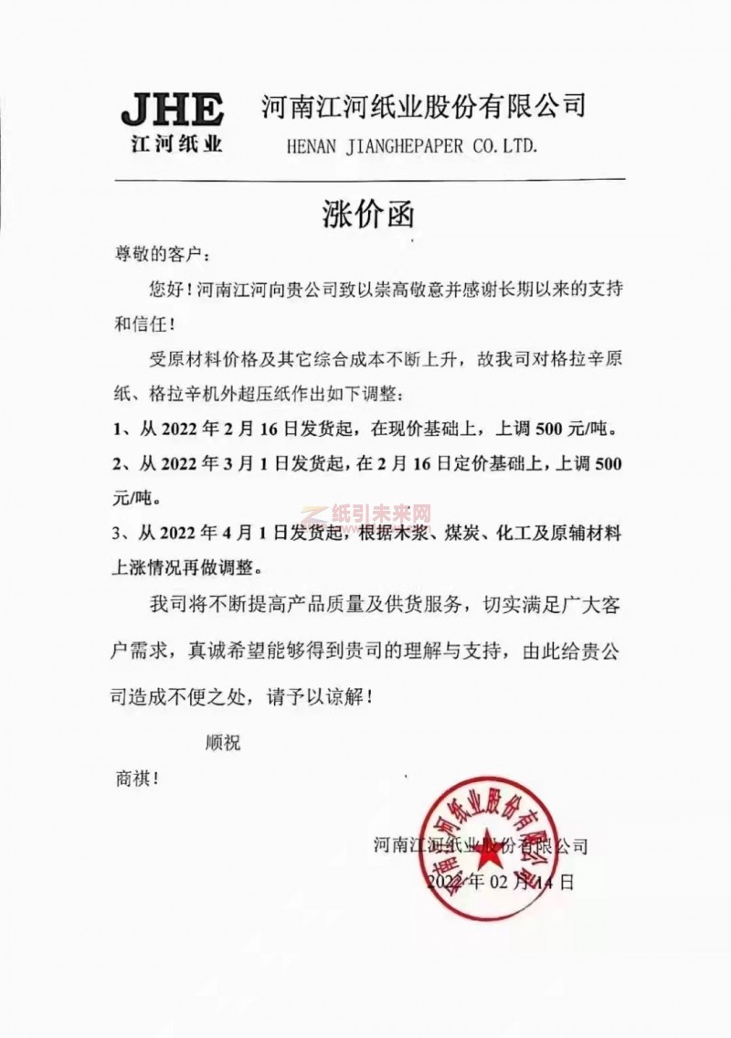 【通知】2022年2月14日河南江河紙業(yè)漲價(jià)函