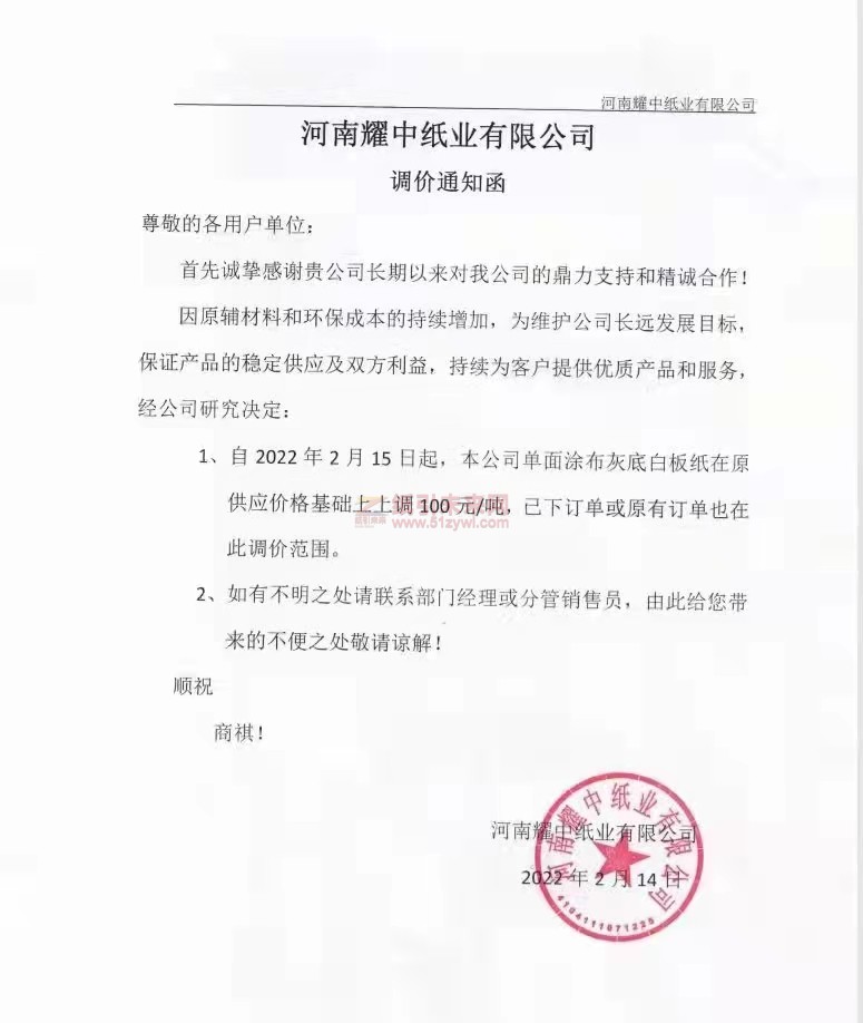 1、自2022年2月15日起,本公司單面涂布灰底白板紙在原供應價格基礎(chǔ)上上調(diào)100元/噸,已下訂單或原有訂單也在此調(diào)價范圍。