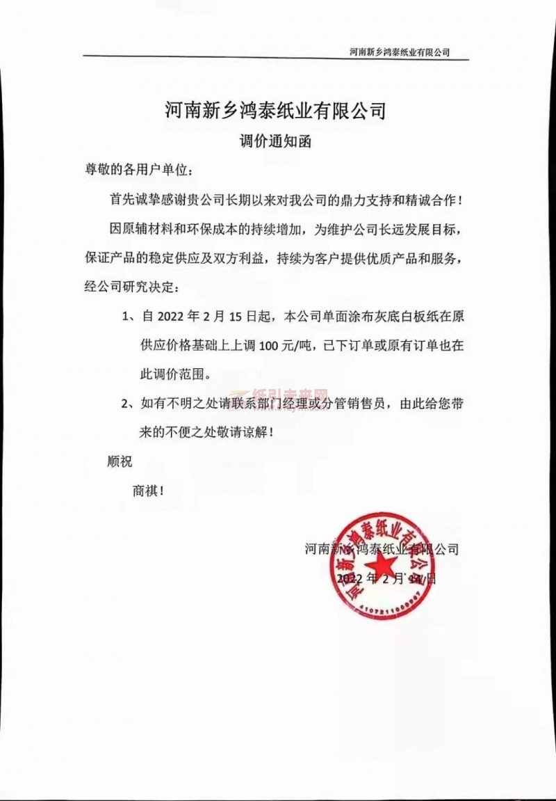 河南新鄉鴻泰紙業有限公司:因原輔材料和環保成本的持續增加,為維護公司長遠發展目標,保證產品的穩定供應及雙方利益,持續為客戶提供優質產品和服務,經公司研究決定: