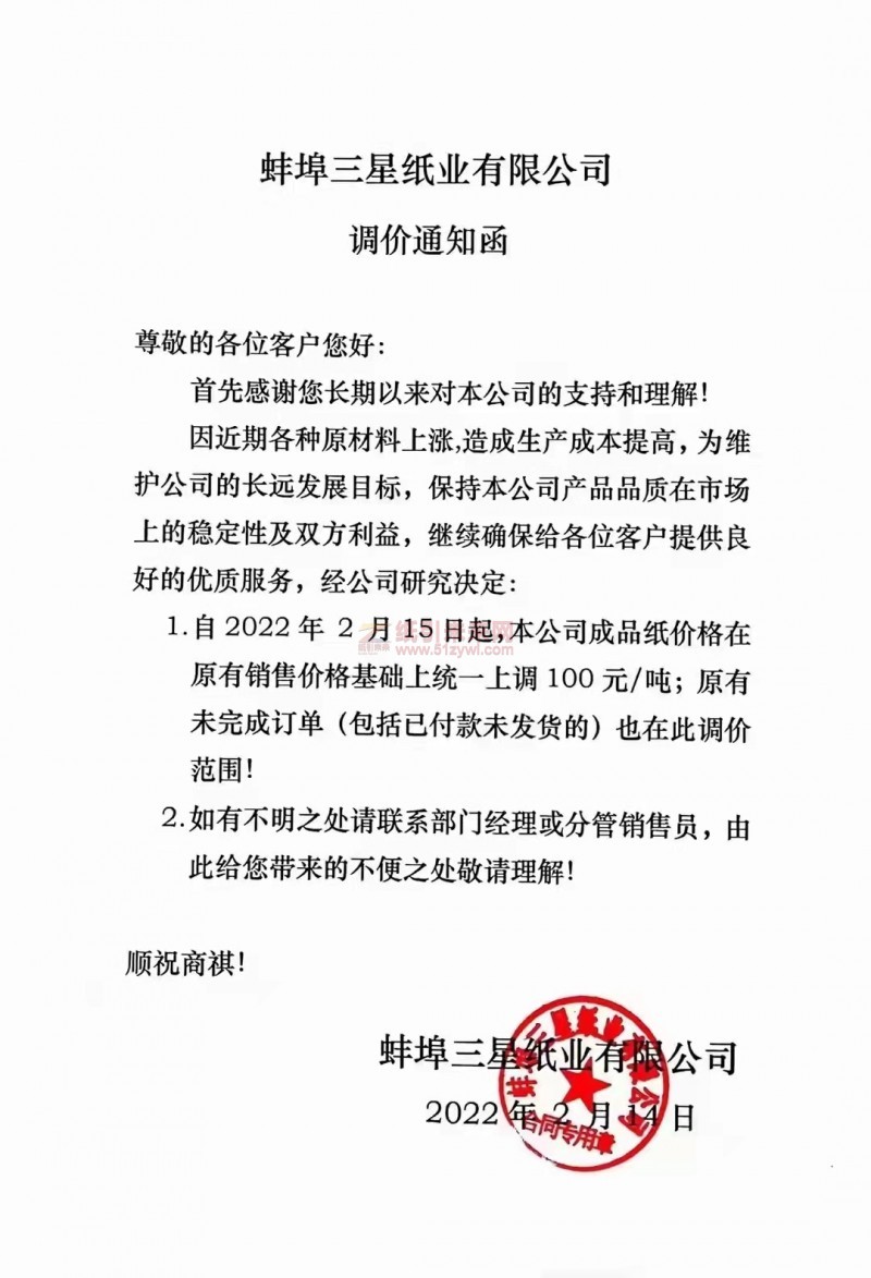 1.自2022年2月15日起,本公司成品紙價格在原有銷售價格基礎上統一上調100元/噸;原有未完成訂單(包括已付款未發貨的)也在此調價范圍!