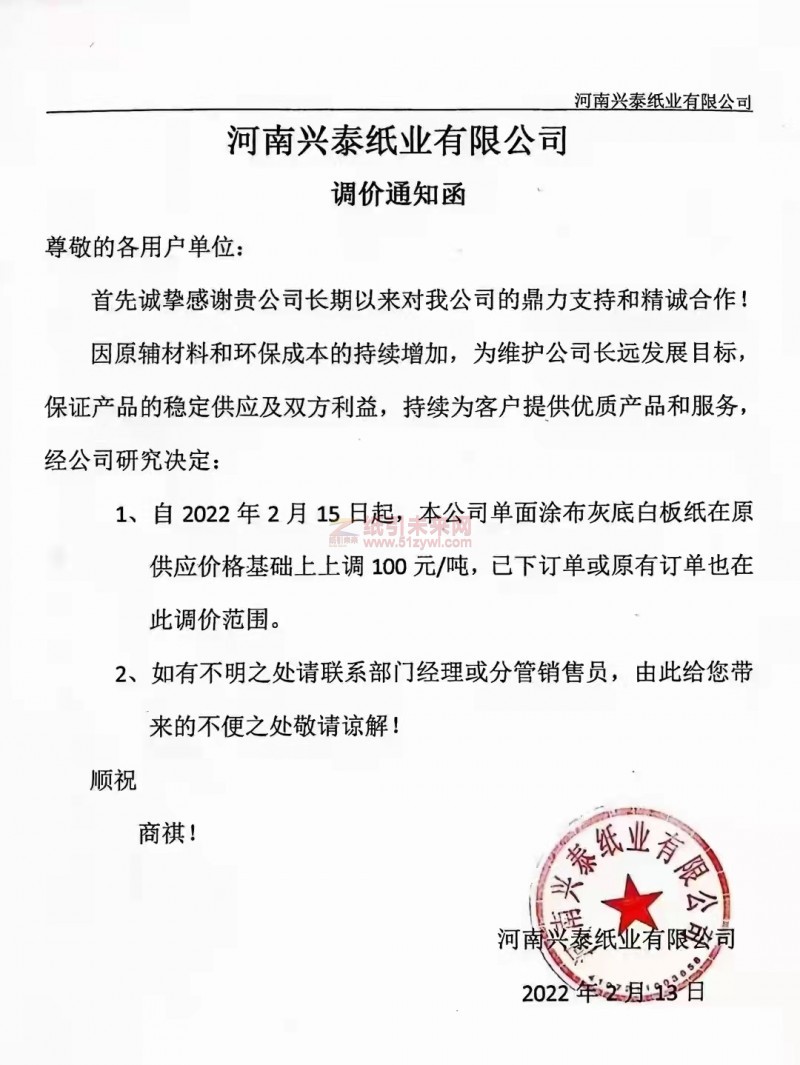 河南興泰紙業有限公司:因原輔材料和環保成本的持續增加,為維護公司長遠發展目標,保證產品的穩定供應及雙方利益,持續為客戶提供優質產品和服務,經公司研究決定: