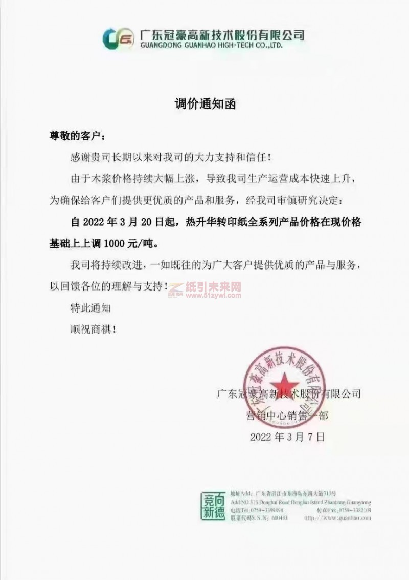 【通知】2022年3月7日廣東冠豪高新技術(shù)股份有限公司漲價函