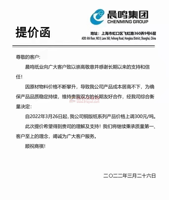【通知】2022年3月26日晨鳴集團(tuán)漲價(jià)函