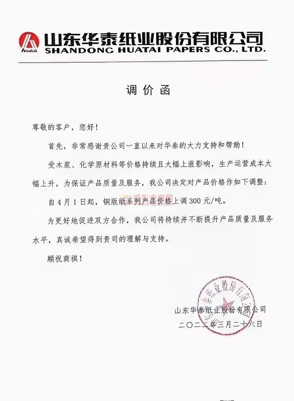 【通知】2022年3月26日山東華泰紙業(yè)漲價(jià)函