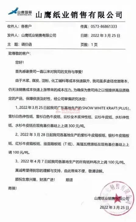山鷹紙業銷售有限公司:由于木漿、煤炭、淀粉、化工輔料等成本快速凝升,我司雖多途徑挖潛降本,仍無法銷售成本快速上張帶來的成本壓力。為確保為貴司持之以恒提供高品質穩定的產品,保障供貨及時性,經公司審慎研究決定: