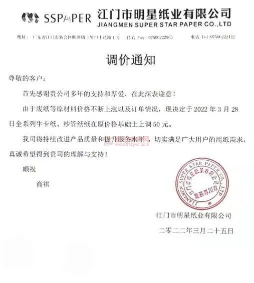 【通知】2022年3月25日江門市明星紙業(yè)漲價(jià)函