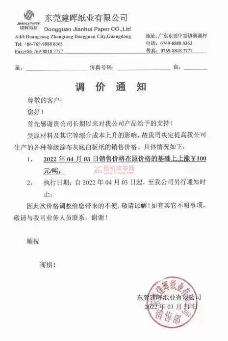東莞建暉紙業(yè)有限公司:受原材料及其它等綜合成本上升的影響,故我司決定提高我公司生產(chǎn)的各種等級涂布灰底白板紙的銷售價格。具休情況如下: