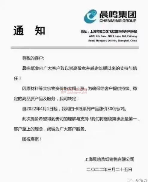 上海局鳴漿紙銷售有限公司:因原材料等大宗物資價格大幅上漲,為確保給客戶提供持續、穩定的高品質產品及服務,我司決定:
