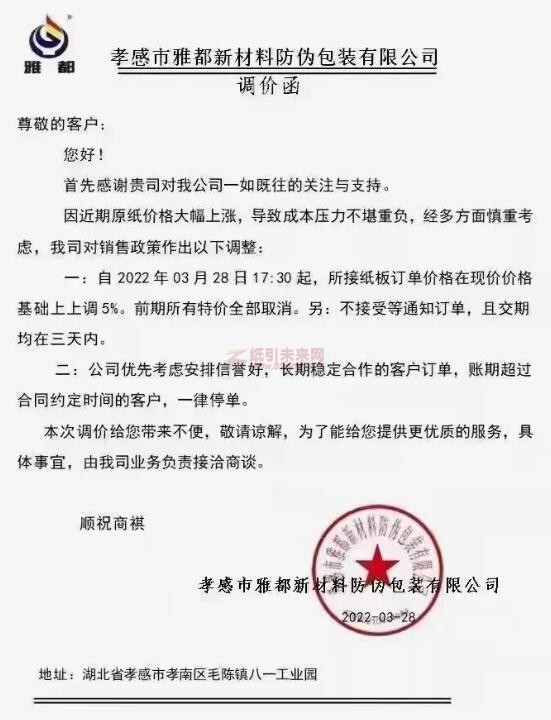 孝感市雅都新材料防偽包裝有限公司:因近期原紙價格大幅上漲,導致成本壓力不堪重負,經多方面慎重考慮,我司對銷售政策作出以下調整: