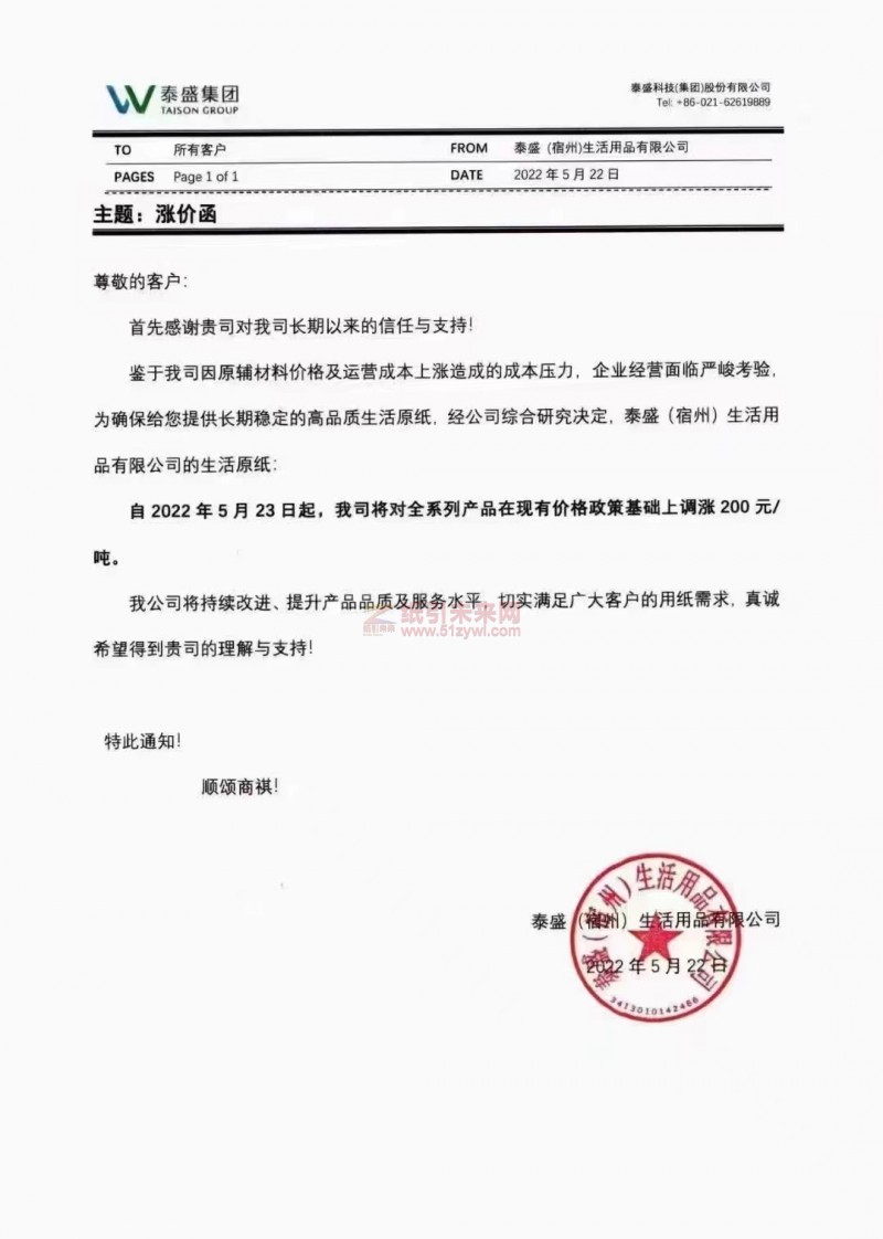 泰盛(宿州)生活用品有限公司:鑒于我司因原輔材料價格及運營成本上漲造成的成本壓力,企業經營面臨嚴峻考驗,為確保給您提供長期穩定的高品質生活原紙,經公司綜合研究決定,泰盛(宿州)生活用品有限公司的生活原紙:自2022年5月23日起,我司將對全系列產品在現有價格政策基礎上調漲200元/噸。