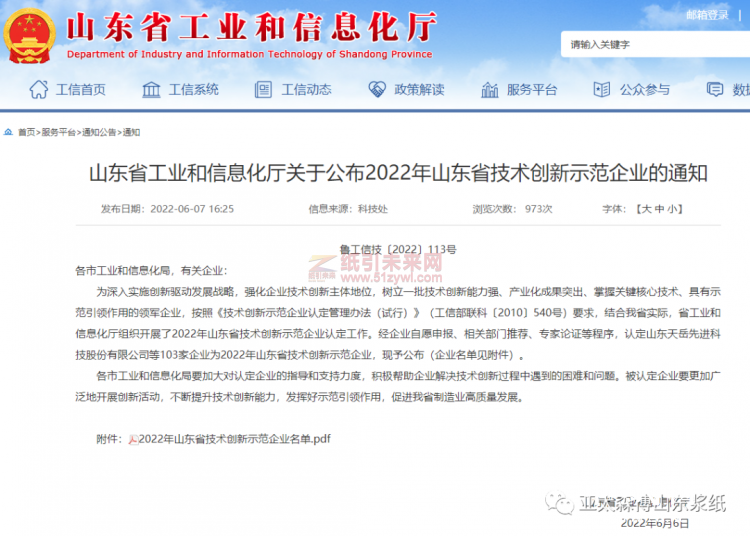 6月7日,山東省工業和信息化廳公布了2022年山東省技術創新示范企業名單。經企業申報、有關部門推薦、專家論證等程序,亞太森博(山東)漿紙有限公司成功入選該名單。