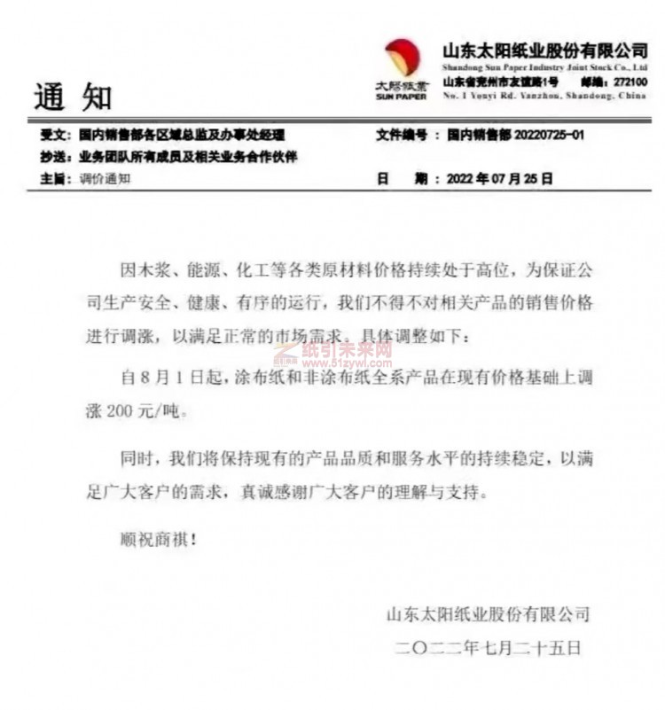 自8月1日起,涂布紙和非涂布紙全系產品在現有價格基礎上調漲200元/噸