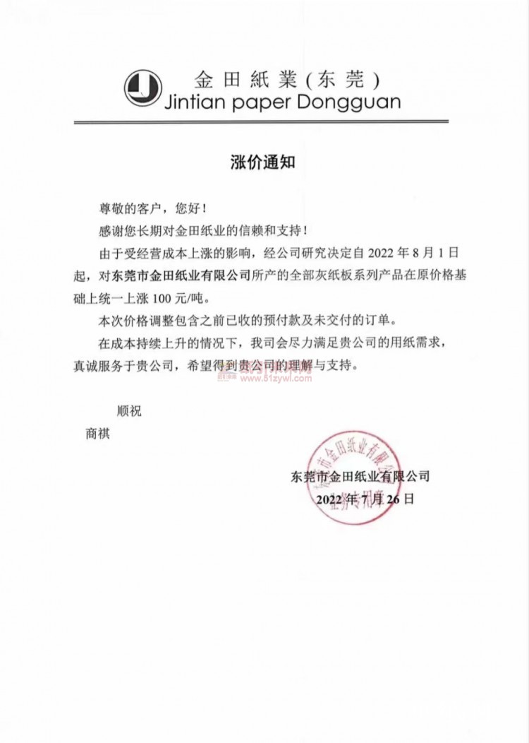 【通知】2022年7月26日東莞市金田紙業漲價函