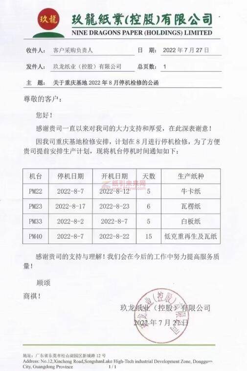 【停機函】2022年8月重慶玖龍紙業停機告知函