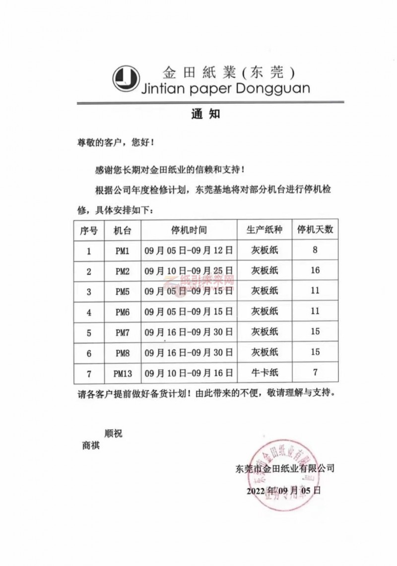 【停機(jī)函】2022年9月廣東東莞金田紙業(yè)部分機(jī)臺停機(jī)檢修通知