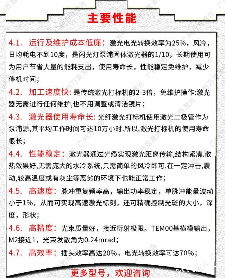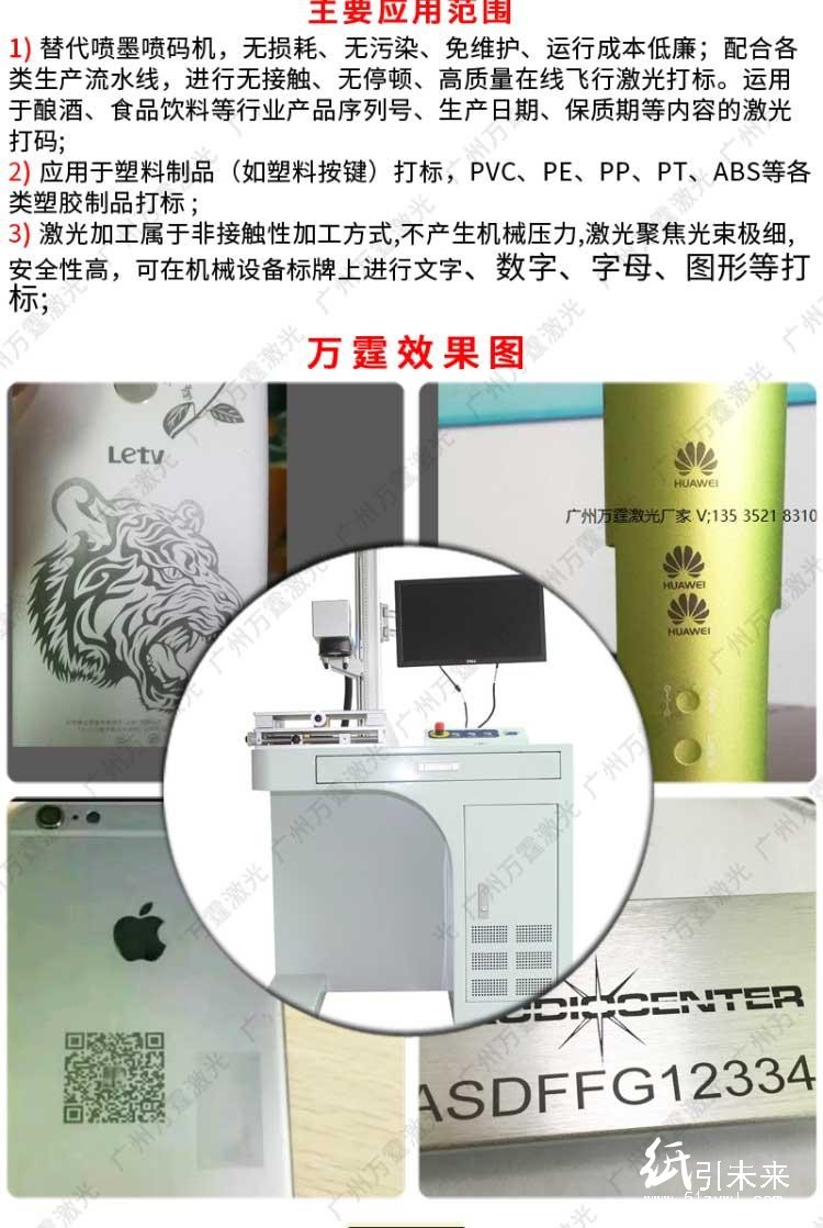 1.該系列為萬霆MOPA激光打標機,采用MOPA激光器,此激光器參數靈活,調節范圍大;采用窄脈寬高頻率參數,熱持續時間短,客戶可通過調節功率、頻率參數來達到自己想要的效果。
