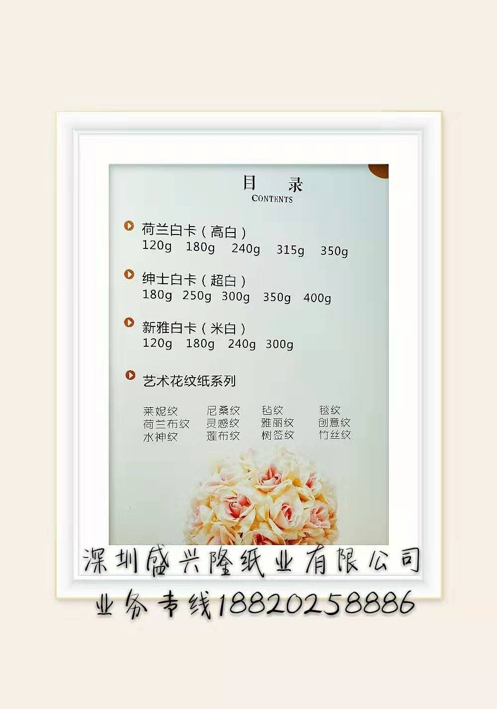 120一400克藝術白卡紙,壓紋紙(荷蘭白、紳士白、新雅米白)各種紋路,花紋訂制。自有加工設備,品質有保障,提供瓦楞紙機,高速分切機,多臺卷筒/平張壓紋機,代客起坑,切紙,壓紋加工